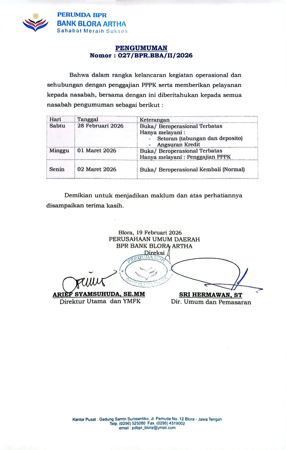 Februari 19 2026 PENGUMUMAN OPERASIONAL AKHIR BULAN FEBRUARI & AWAL BULAN MARET 2026 bankbloraartha Laporan Keberlanjutan 0 Bahwa dalam rangka penggajian PPPK dan sehubungan dengan kelancaran kegiatan operasional serta memberikan pelayanan kepada nasabah, bersama dengan ini diberitahukan kepada semua nasabah pengumuman sebagai berikut :